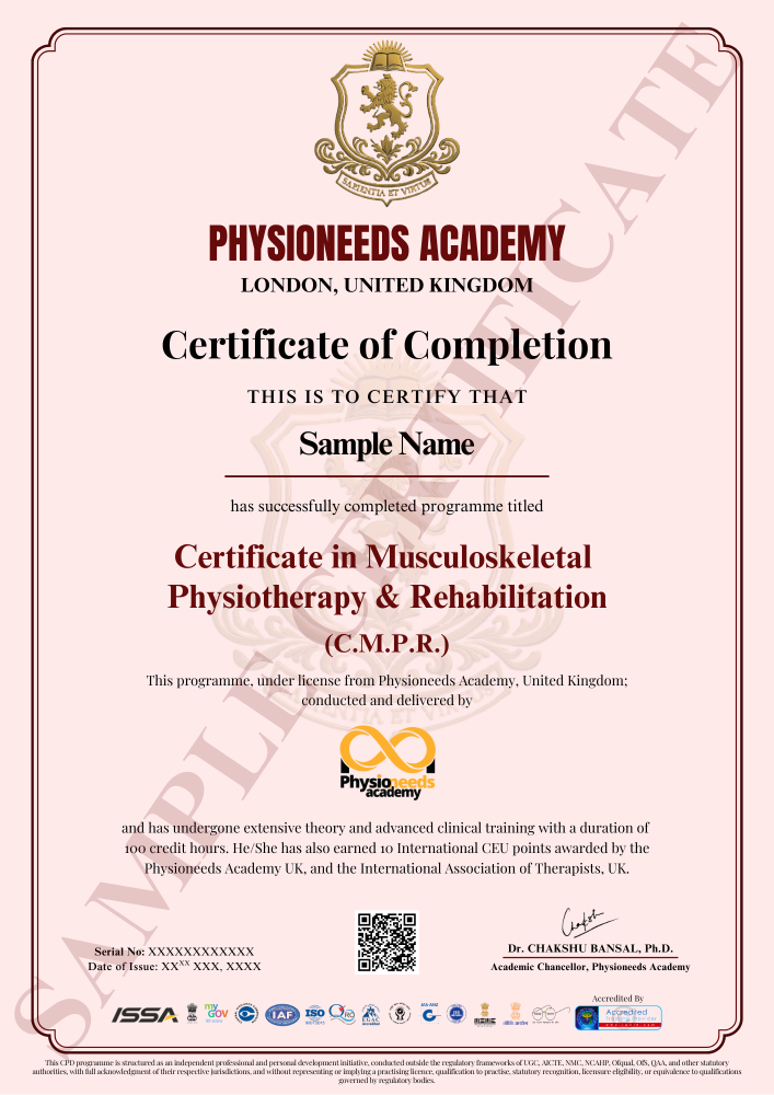 The Certificate in Musculoskeletal Physiotherapy and Rehabilitation is an intensive training program aimed at equipping physiotherapists with specialized skills in musculoskeletal assessment, treatment, and rehabilitation strategies. This course offers a structured approach to musculoskeletal care, integrating manual therapy, exercise prescription, dry needling, taping, and IASTM for optimal patient recovery.Through interactive lectures, live practical sessions, and real-world case studies, participants will develop competency in diagnosing and treating musculoskeletal disorders using the latest evidence-based techniques.