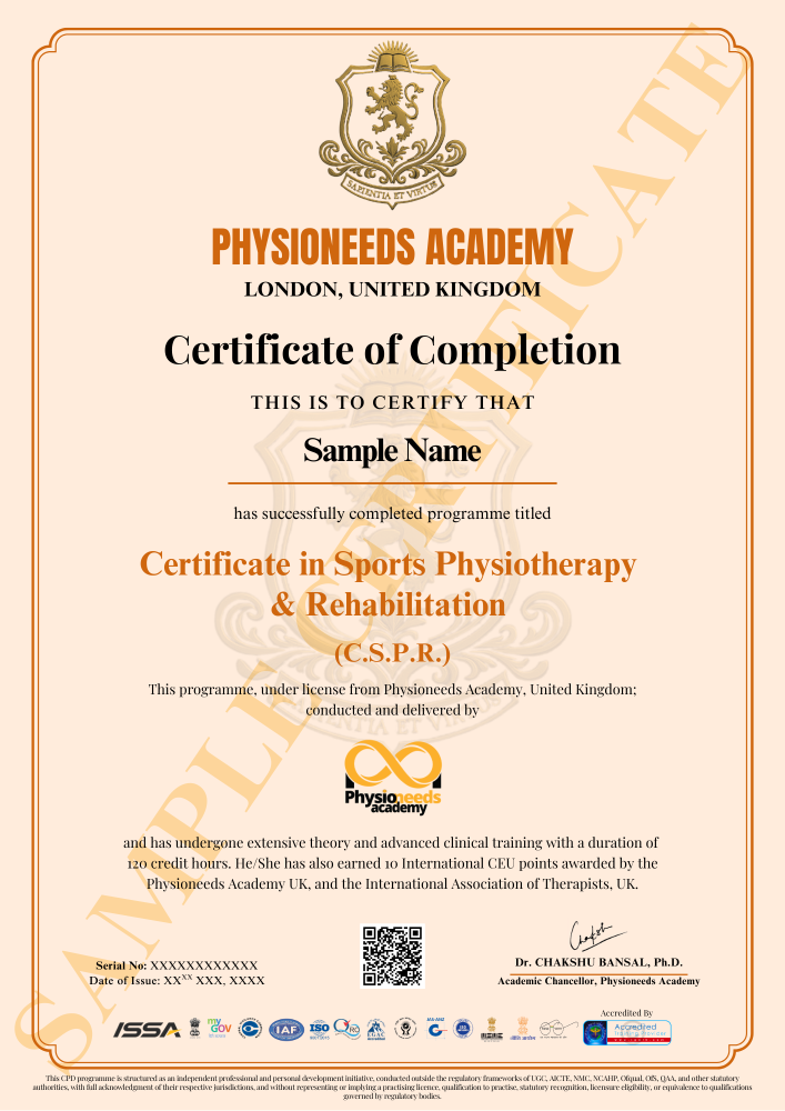 The Certified Sports Physiotherapy & Sports Rehab Specialist (CSPRS) program is designed for physiotherapists aiming to enhance their expertise in sports injury management, rehabilitation, and performance enhancement. Led by Dr. Chakshu Bansal, a global leader in sports therapy and rehabilitation, this course provides a comprehensive, clinical approach to treating and preventing sports injuries.This program covers advanced assessment techniques, manual therapies, exercise prescription, taping methods, and rehabilitation protocols used by top sports therapists worldwide.